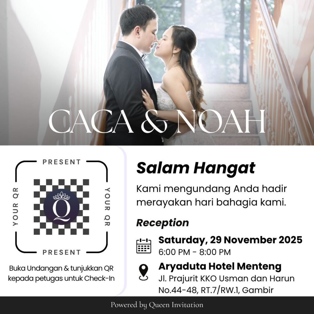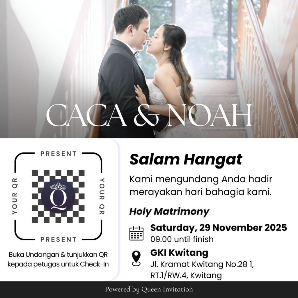 THE WEDDING OF Caca & Noah SATURDAY, 29 NOVEMBER 2025 Scan QR Code PERSONALIZED FOR Tamu Undangan Scan this QR to sign the Guest Book & confirm attendance. “Therefore what God has joined together, let no one separate.” Mark 10:9 (NIV) 00DAY 00HOUR 00MINUTES 00SECOND Add to Calendar CN WEDDING CEREMONY By the Grace and […]